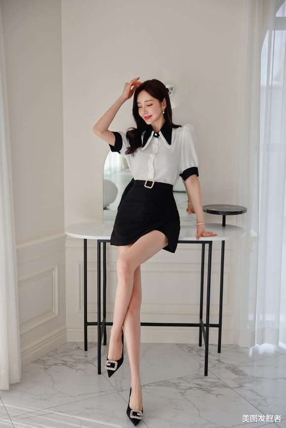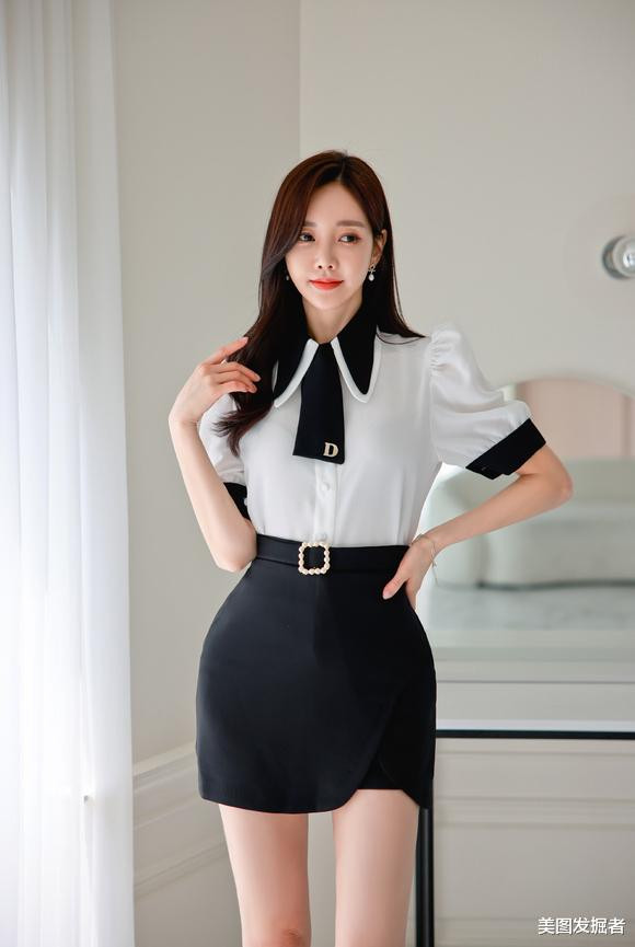 这波穿搭简直是教科书级别,衬衫解开两颗纽扣,若隐若现的锁骨链不经意间透着小女人味。袖口的黑边设计和领结相呼应,腰带和短裙颜色统一,从视觉上拉长了下半身比例。最重要的是,这身穿搭完美展现了身材优势,包臀裙把臀部线条勾勒得恰到好处,高跟鞋让腿部肌肉线条更流畅,浑身上下都是戏。